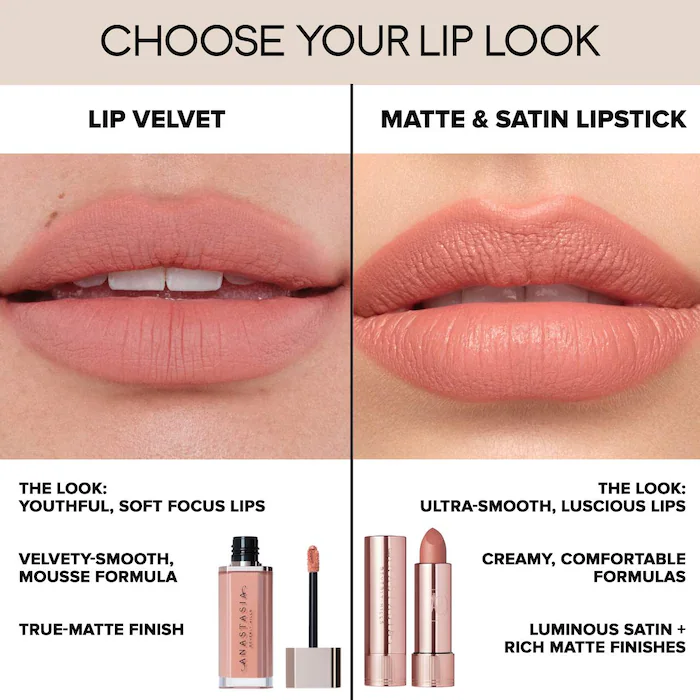 What Else You Need to Know: Anastasia Beverly Hills Lip Velvet is a velvet-smooth lip mousse with weightless, full pigment, true-matte color, cushioned, comfortable wear, and a smoothing lip finish that allows you to line and apply with a multifunctional, teardrop-shaped cushioned wand.