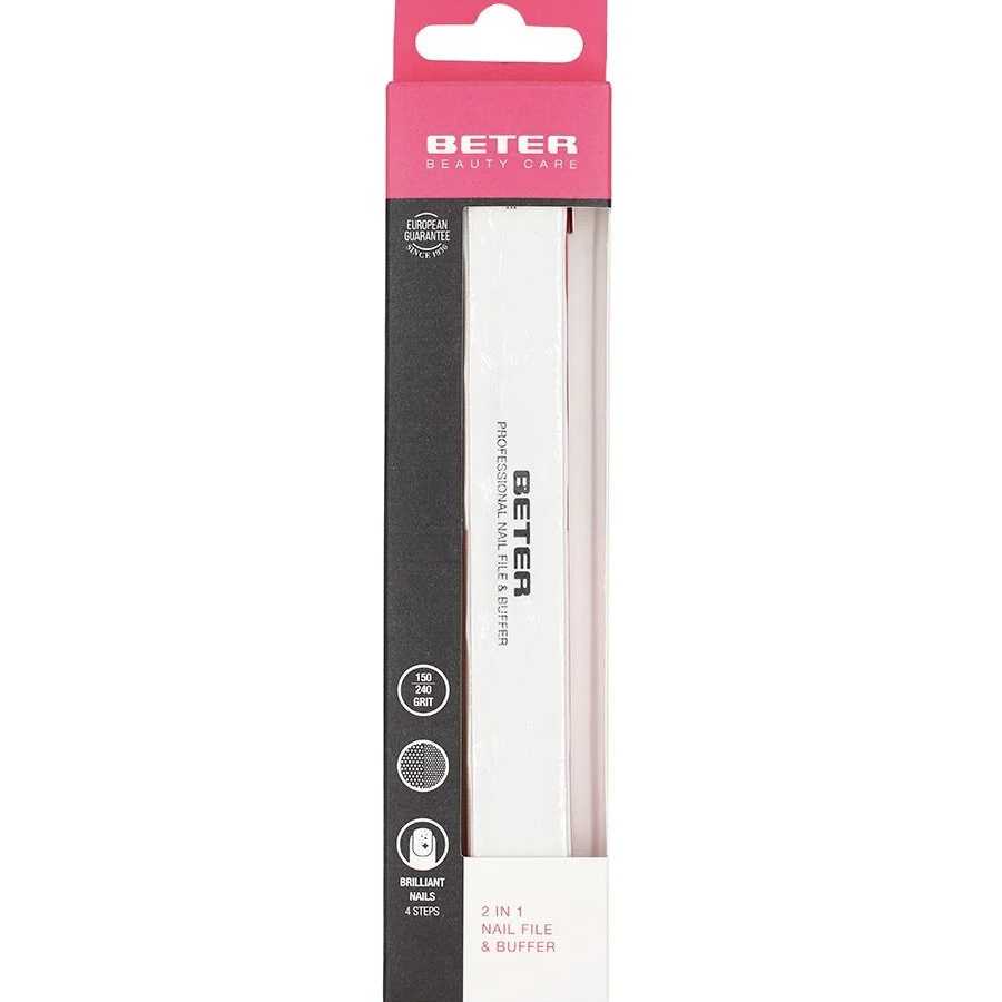 Achieve salon-quality nails at home with the Beter Nail File & Buffer 2 In 1. This versatile tool features a double-sided design that effortlessly files and smooths nails for a polished finish. One side is perfect for shaping and shortening nails, while the other side buffs for a shiny, professional look.