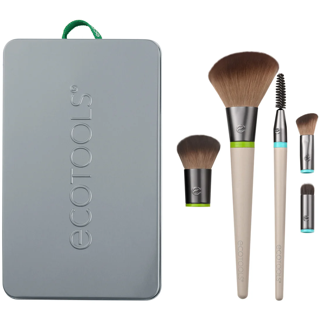 • The EcoTools Daily Essentials Set Includes: (1) large brush handle, (1) small brush handle, (1) Large Angled Blush brush head, (1) Large Base Buffer brush head, (1) Small Spoolie brush head, (1) Small Angled Crease brush head, (1) Small Airbrush Concealer brush head, and (1) Reusable Tin Tray with lid