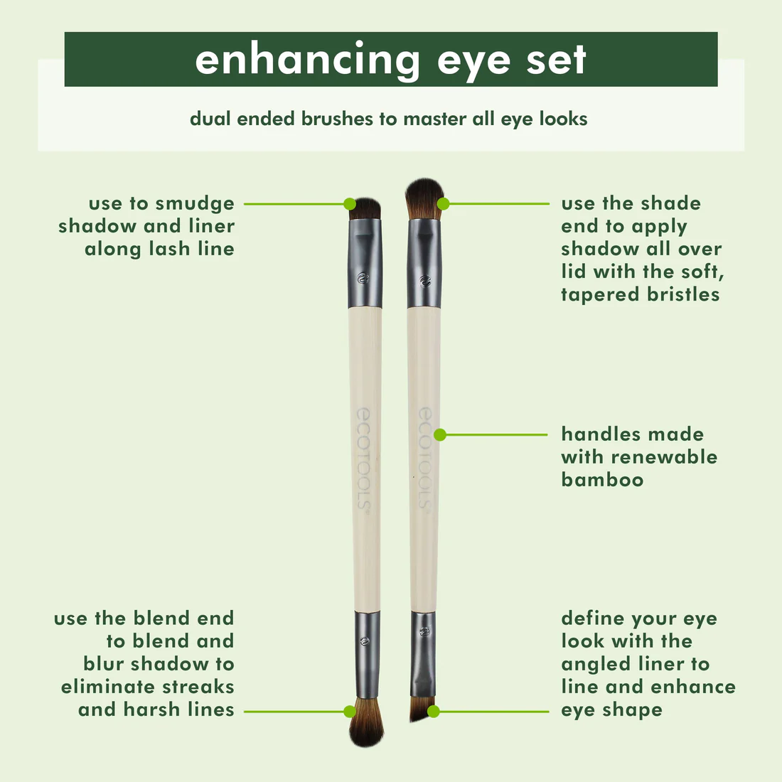 • The EcoTools Eye Enhancing Set is designed with 4 brush heads to shade, define, blend and smudge