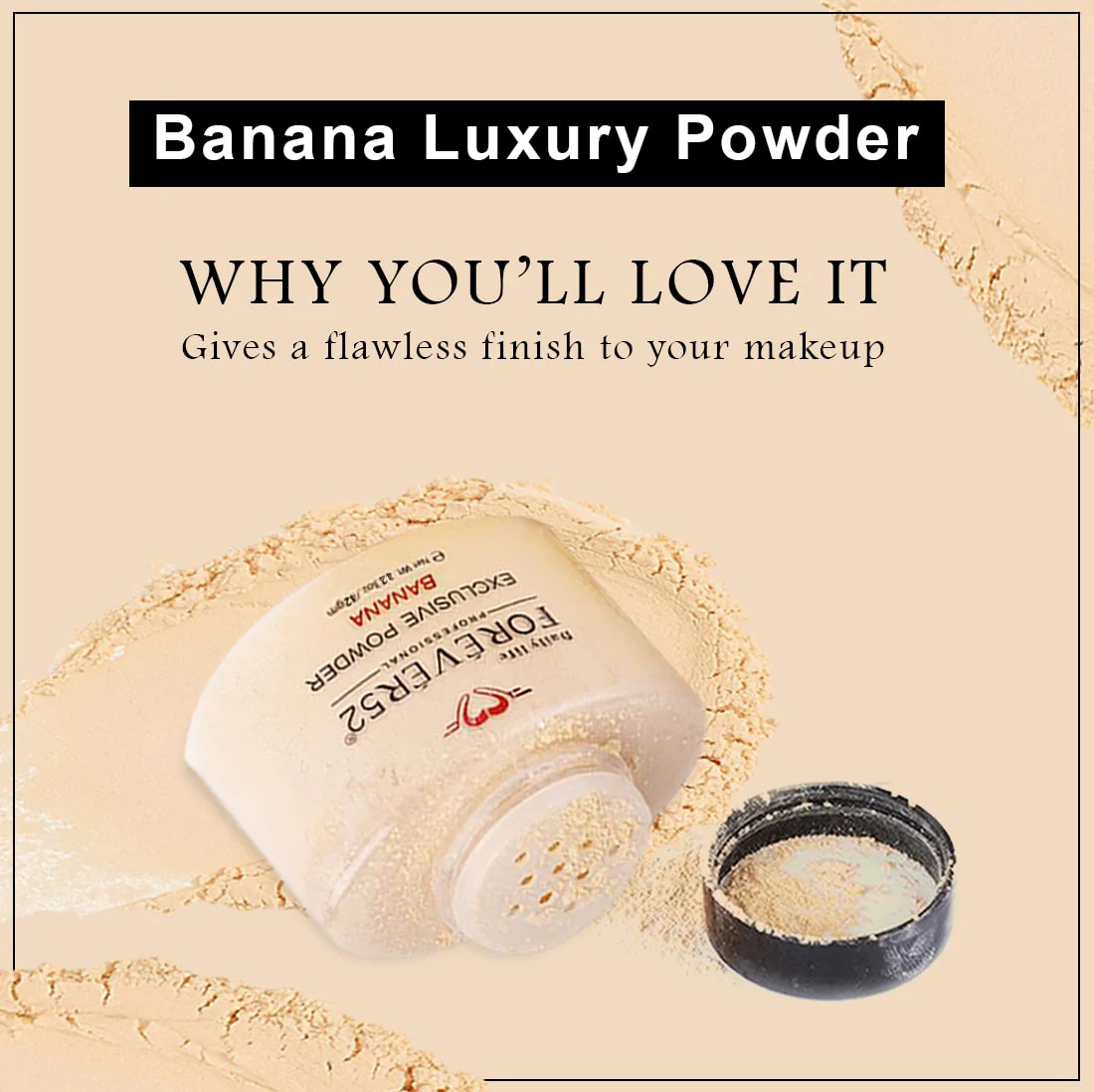 Daily Life Forever52 Exclusive Powder is mattifying banana powder. With a hint of color set for your foundation and to reduce shine whilst correcting redness and pink undertones. With a sieve to prevent clumping and ensure it is easy to apply. It absorbs oil, and enhances your skin tone, giving you a gorgeous glow. Daily Life Forever52 Exclusive Powder highlights, color corrects, and sets makeup giving you a flawless and matte base! Designed to be used in your normal contouring regime, or even just on its own, this powder can be applied under your eyes, on your forehead, on the bridge of your nose, and on your chin.