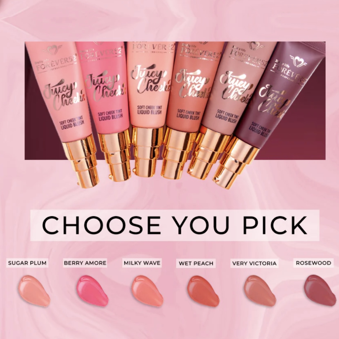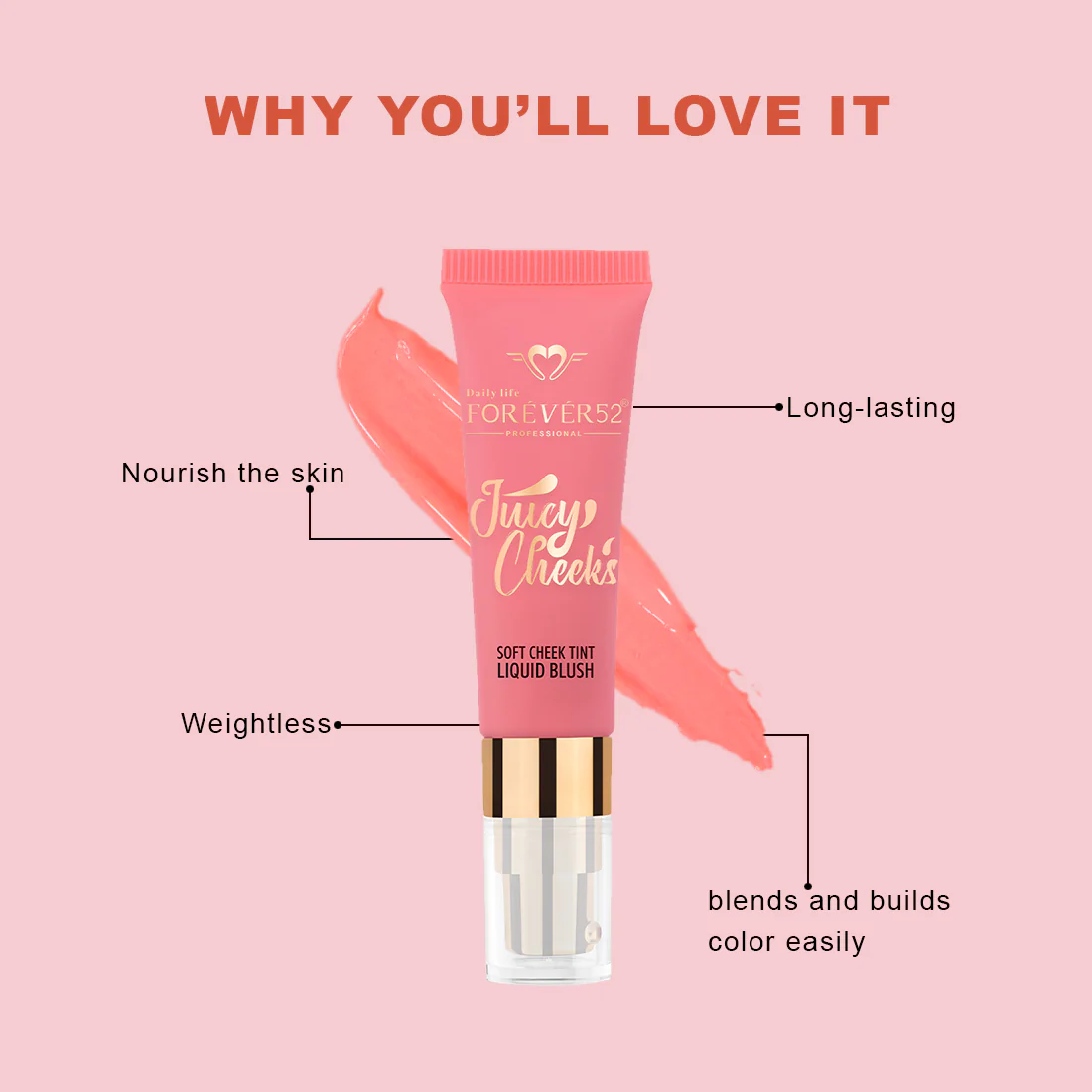 Daily Life Forever52 juicy cheek’s serves as soft tint that gives your cheek a natural rosy pop. A weightless, long-lasting liquid blush that blends and builds beautifully for a soft, healthy flush. Available in matte and dewy finishes.