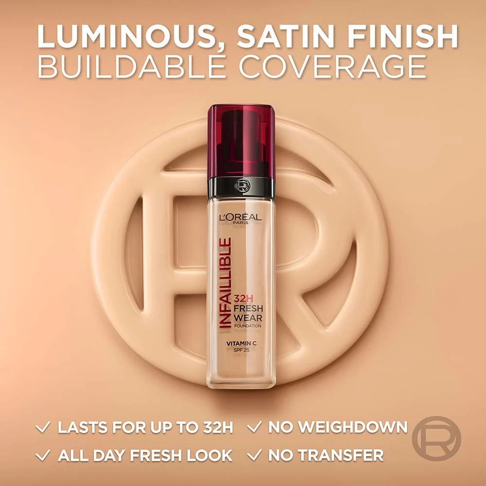 See your skin in its best light yet thanks to the Infallible 32H Fresh Wear Foundation which is both long-lasting and lightweight. L’Oréal Paris presents its most breathable longwear foundation, now formulated with a combination of two powerful ingredients: Vitamin Cg which helps the skin look smoother and brighter in 4 weeks, as well as the light diffusing micro-pearls, making it luminous from the first swipe. Erase your skin’s dullness instantly with this long-wear yet lightweight foundation. Designed to last for up to 32hours while still allowing the skin to breathe. A transfer-resistant finish that won’t shift on the skin throughout the day and is resistant against water and sweat. The formula is lightweight with no cakey or heavy feeling and can build to the desired level of coverage. This luminous foundation is available in 24 shades, evenly split between light, medium, and deep tones, so that every skin tone can become flawless, i.e., “Infallible”. Our Fresh Wear foundation is designed to be perfect inside and out, featuring a modern and sleek bottle that can be recycled. Indulge in an ultimate skincare and beauty experience, with our buildable, luminous formula that will make your skin feel radiant all day long.