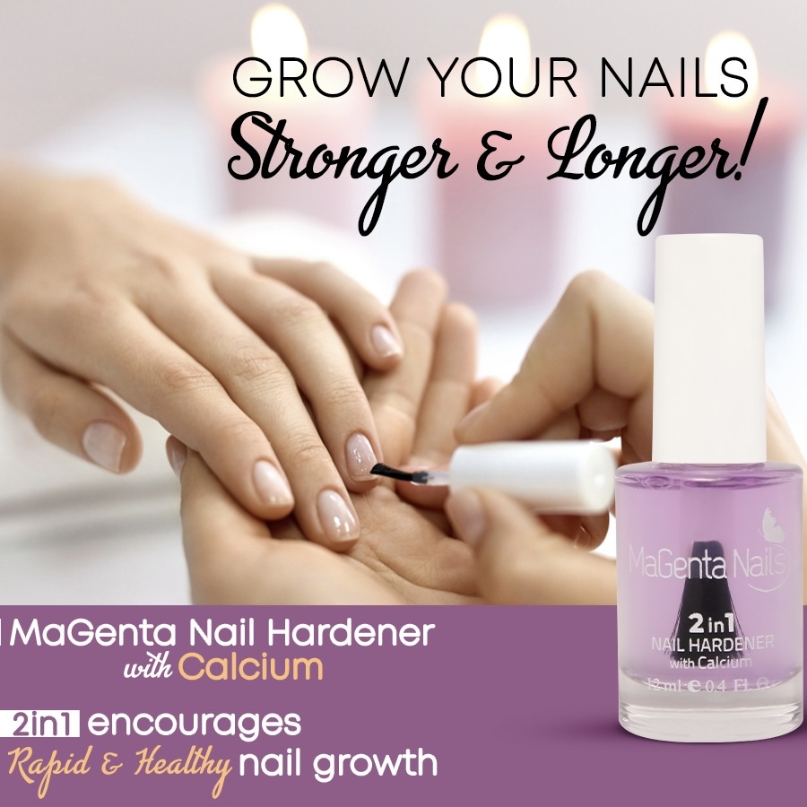 MaGenta Nail Hardener with Calcium 2 in 1 encourages rapid & healthy nail growth while eliminating splitting or cracking nails.