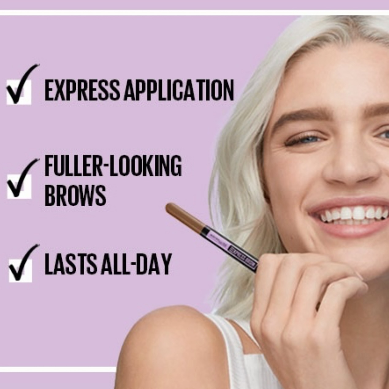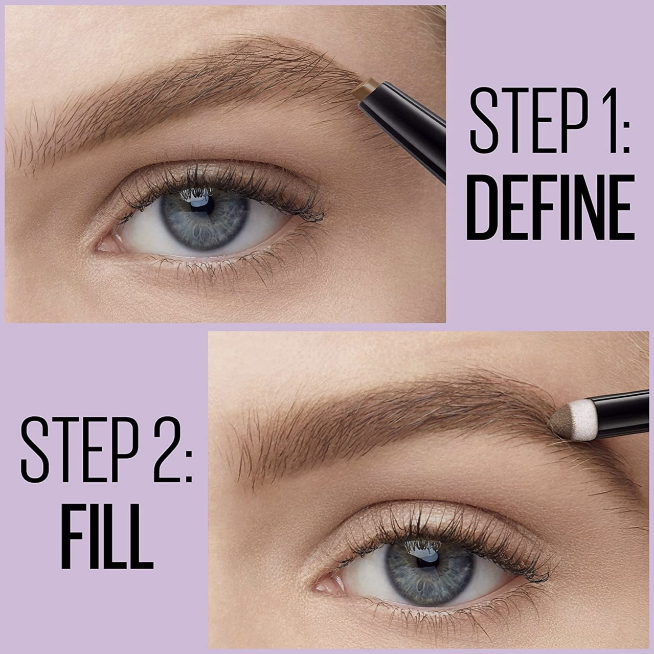 Grab the express to easy, full brows. Meet Maybelline New York’s Express Brow 2-In-1 Pencil + Powder. It’s our fastest all-in-one tool for instantly fuller, natural- looking eyebrows. This eyebrow duo has a precise teardrop tip on one side that easily defines and shapes brows and a powder packed sponge on the other side that fills and smoothes, delivering brows that wow. Get your ticket to an effortless filled brow. Ophthalmologist tested. Suitable for contact wearers.