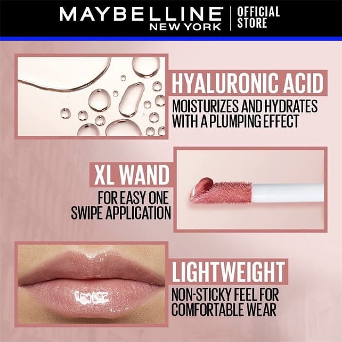 Hydrated lips. Fuller look. This breakthrough formula with Hyaluronic Acid visibly smooths lip surface and enhances lip contour with high shine for hydrated, fuller looking lips. Plus, its XL wand transforms lips in an easy, one swipe application.