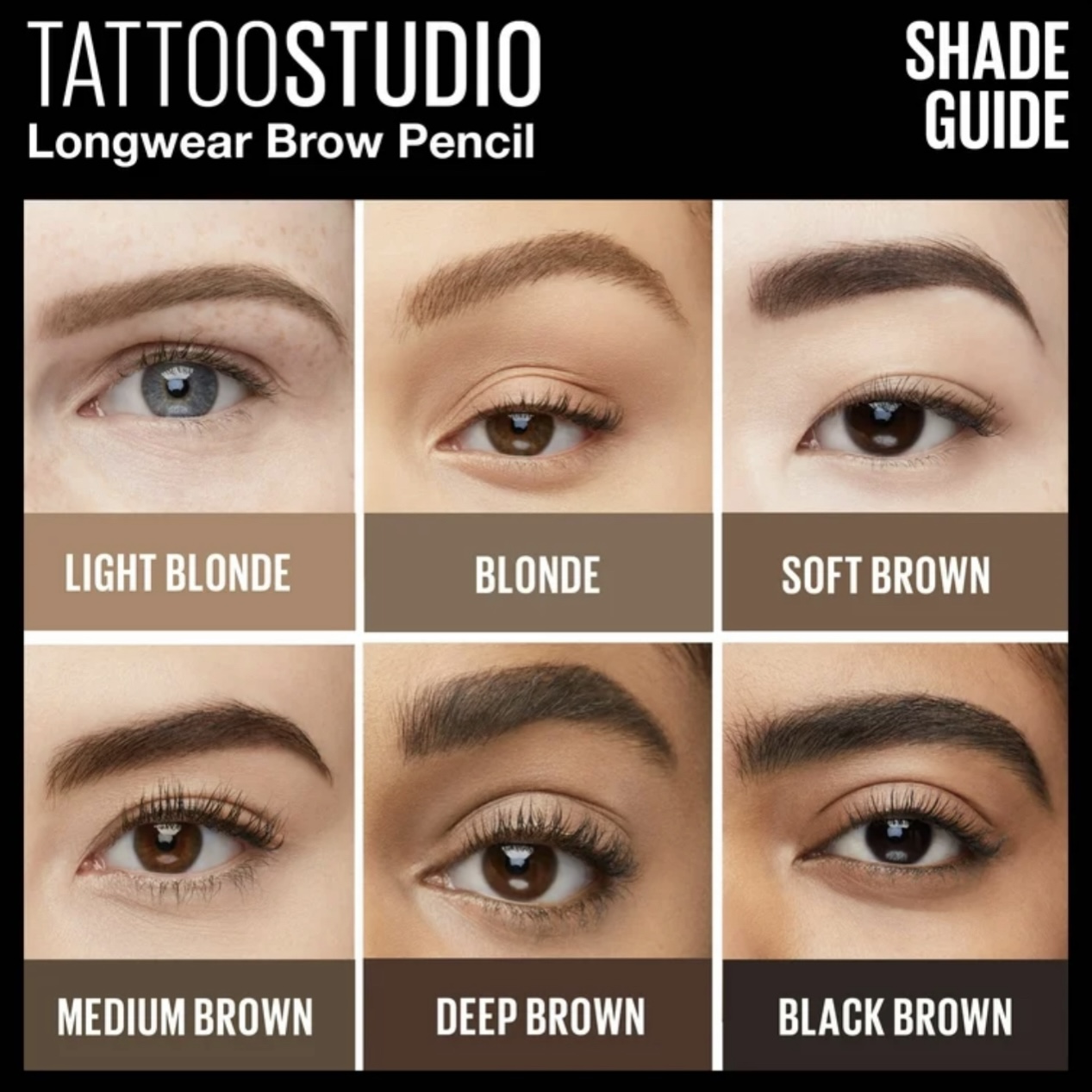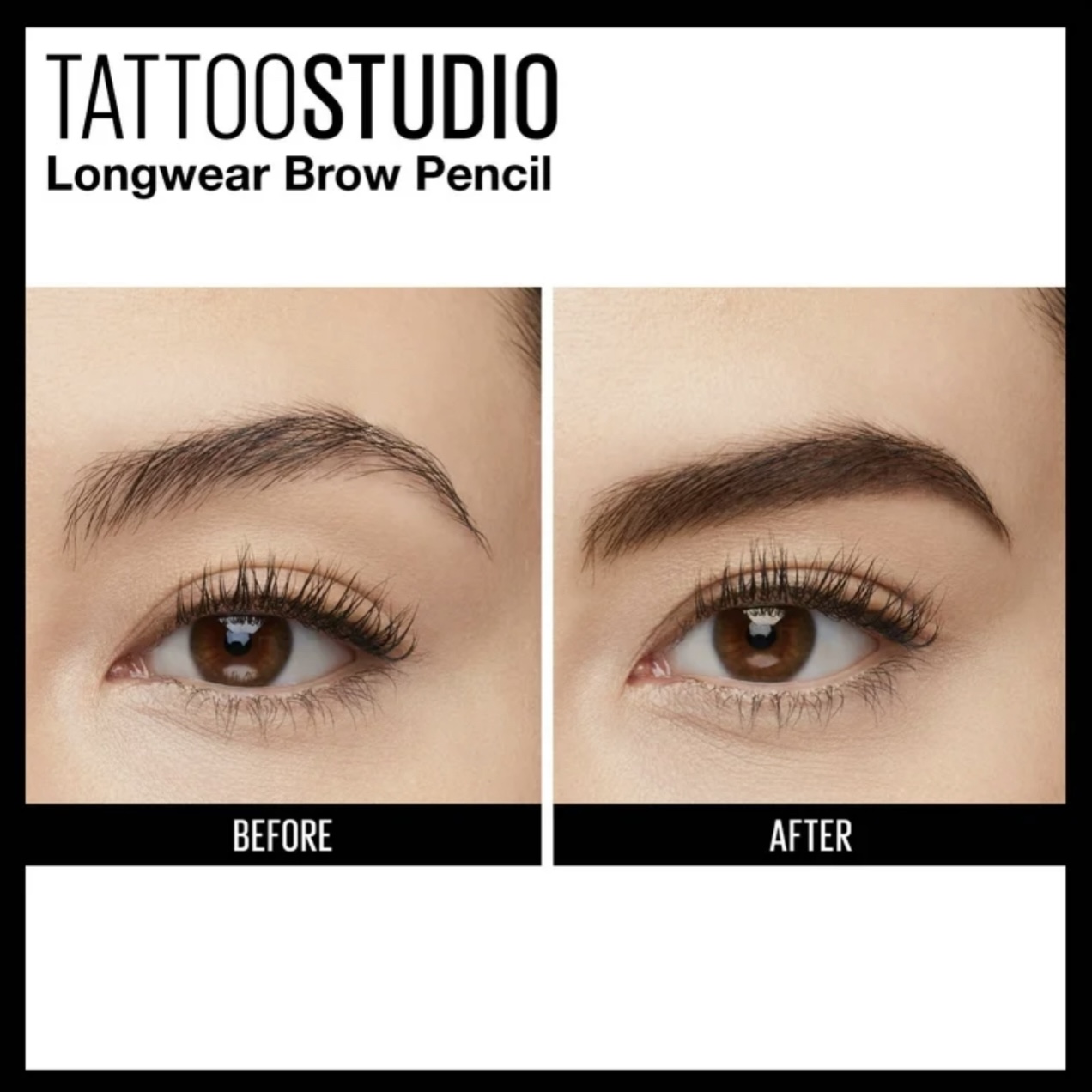 Maybelline TattooStudio Tattoo Brow 36HR Pigment Brow Pencil in an easy-to-use, ultra-performance brow pencil. Get 36HRS, long-lasting waterproof brow impact with ease. This eyebrow filler is made with bold pigments, delivering the highest levels of pigment in an eyebrow pencil. Tattoo Brow 36HR Pigment Eyebrow Pencil defines, fills, and fixes uneven eyebrows without smudging and fading throughout the day. Tattoo Brow 36HR includes a spoolie eyebrow brush on one end for defined, blended, and natural-looking brows. Available in six ultra-performing and ultra-inclusive shades that show up on diverse skin tones.