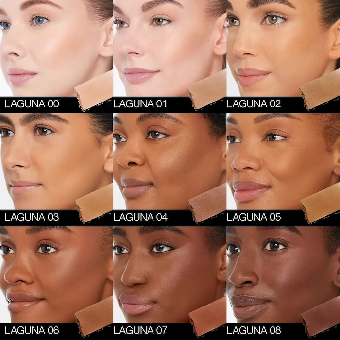 -For a contoured effect, apply Laguna Bronzer Powder one to two shades deeper than the natural skin tone in the hollows of the cheekbones and jawline.