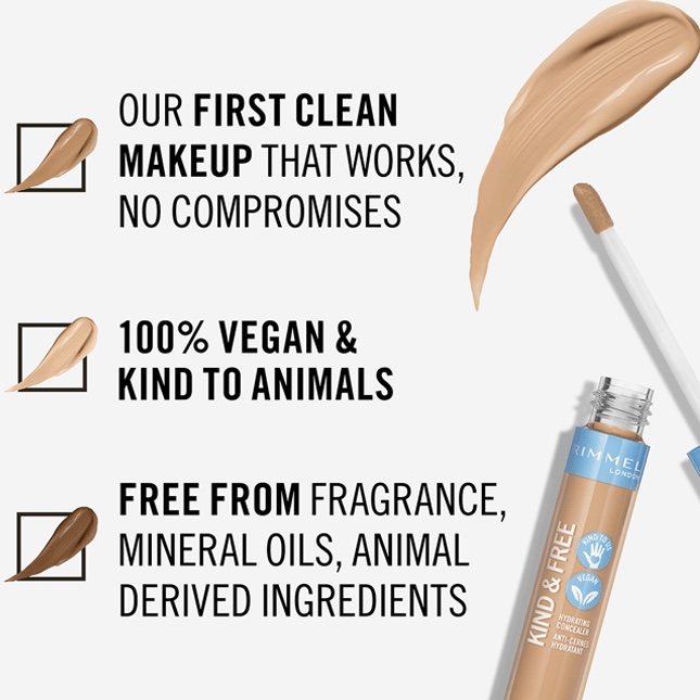 Rimmel first clean makeup that works, no compromises. 100% vegan & kind to animals. Free from fragrance*, mineral oils, animal derived ingredients*.
