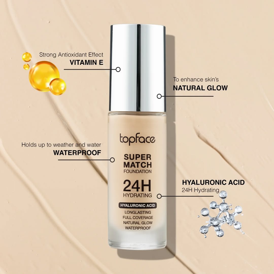 Topface Super Match 24H Hydrating Foundation delivers flawless full coverage while keeping your skin hydrated all day. Infused with hyaluronic acid and vitamin E, this vegan, gluten-free formula nourishes and soothes, making it perfect for sensitive skin. Its water-resistant, long-lasting wear effortlessly conceals blemishes, dark spots, and discoloration, creating a smooth, even complexion with a natural finish