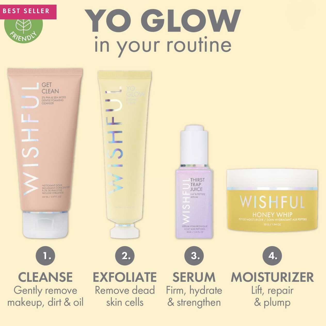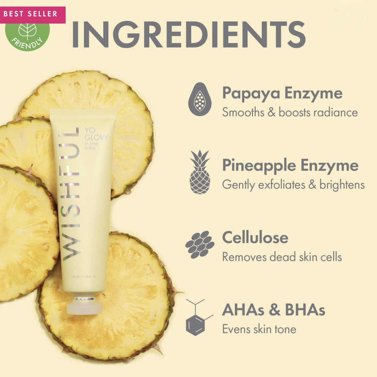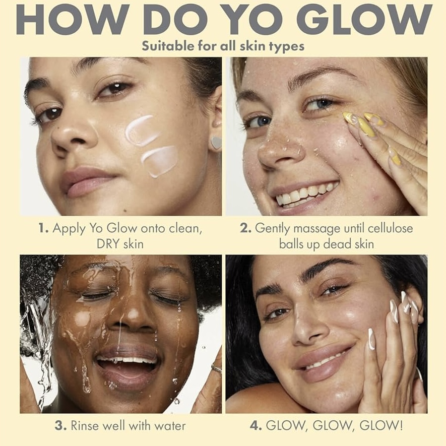 Yo Glow combines the power of 3 different exfoliation techniques: Fruit Enzymes, AHAs & BHAs, and Physical. This unique combination leaves the skin with a healthy glow.