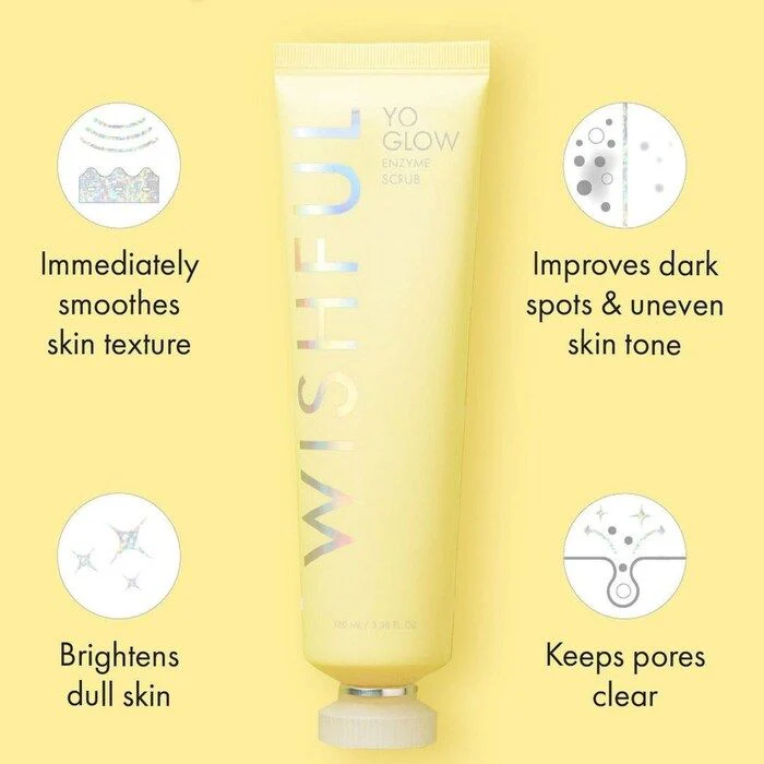 Yo Glow Enzyme Scrub is an exfoliating scrub infused with a combination of pineapple and papaya enzymes, BHAs and AHAs that leave the skin with a healthy glow. The lightweight, milky texture gently buffs away dead skin cells and impurities for immediate results that also makes the perfect canvas for seamless makeup application.